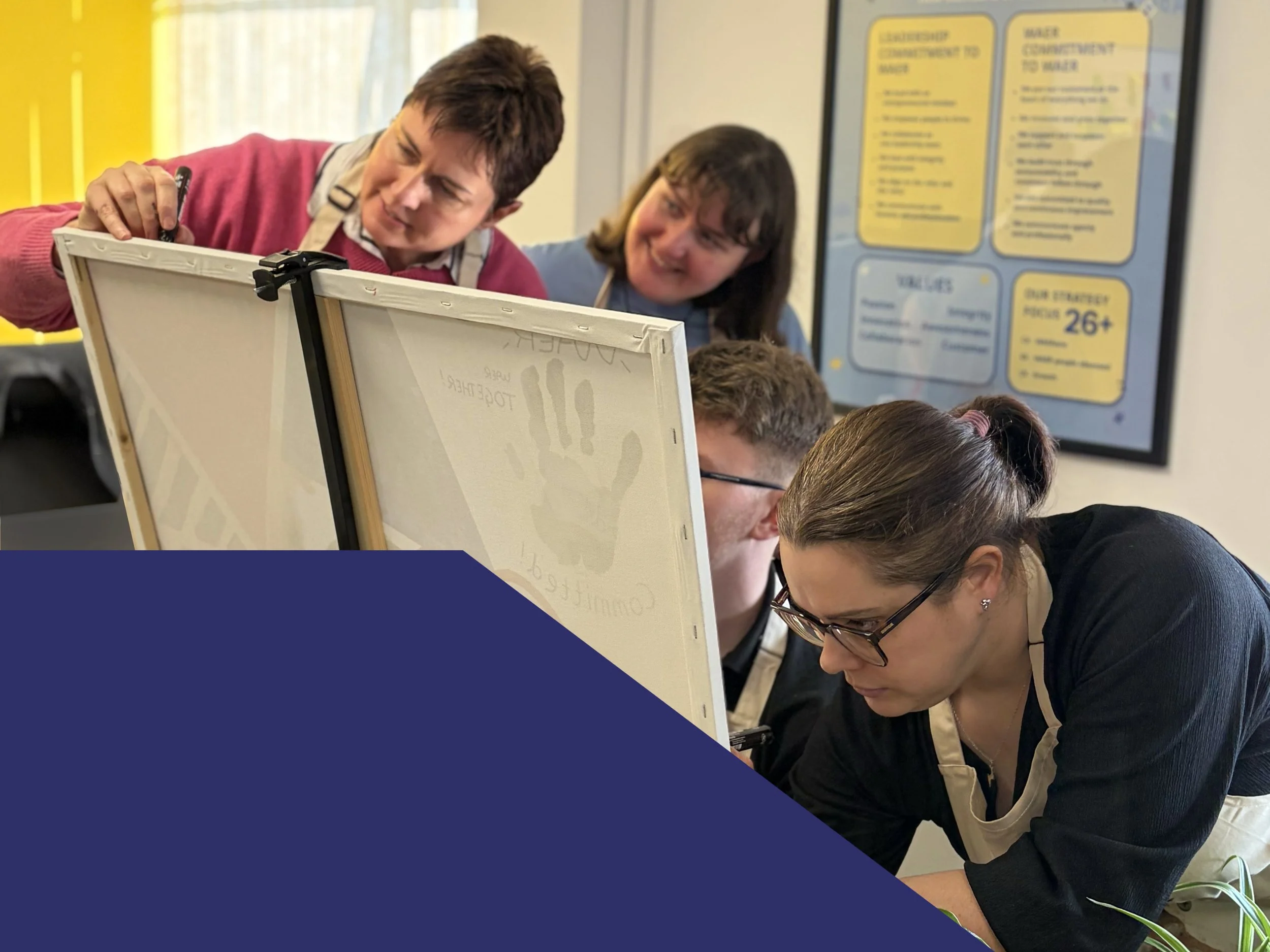 Each group is assigned a company value and encouraged to discuss what that value represents in everyday working life. Through colour, symbols and imagery, teams translate their ideas into a shared artwork.